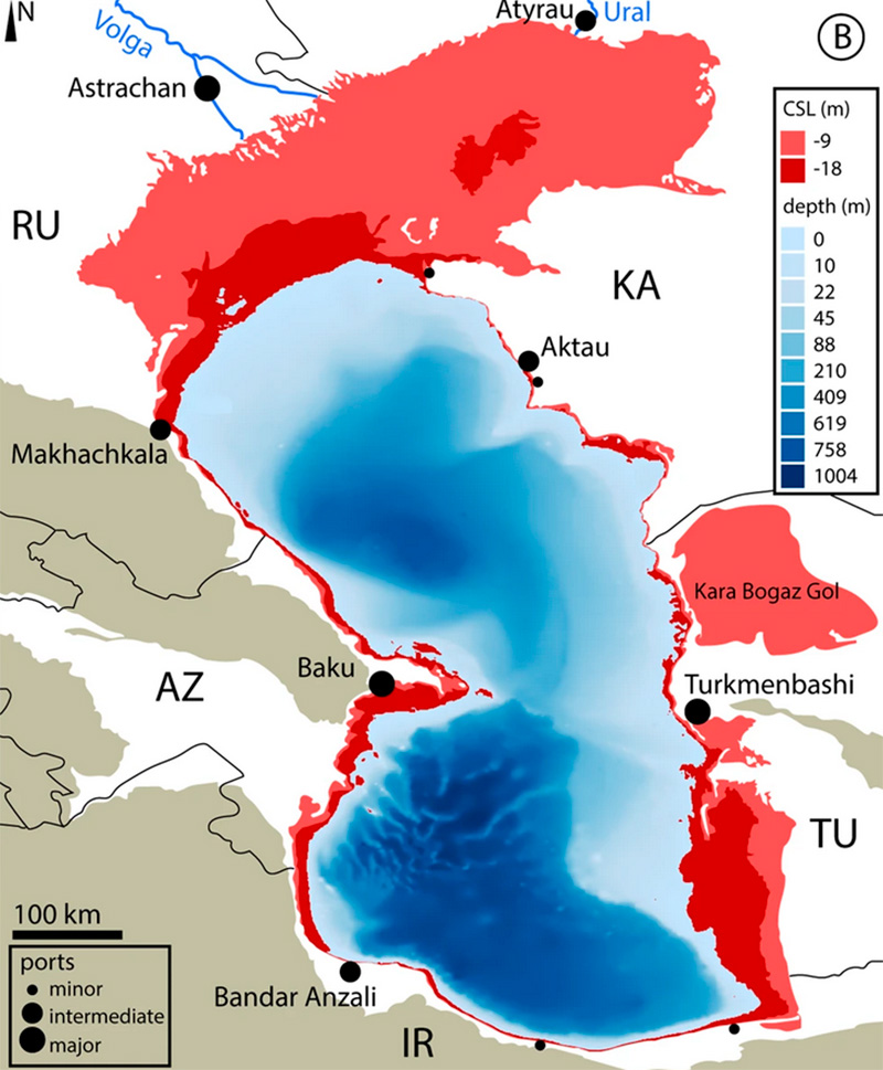 “Esta [disminución del nivel del mar] se da de manera uniforme en toda la cuenca, pero sus manifestaciones más notables se observan en las zonas poco profundas con fondo plano. A ellas pertenece prácticamente toda la costa del norte del Caspio, tanto de la Federación Rusa como de Kazajistán. Aquí el mar se ha retirado entre varios kilómetros y varias decenas de kilómetros”.