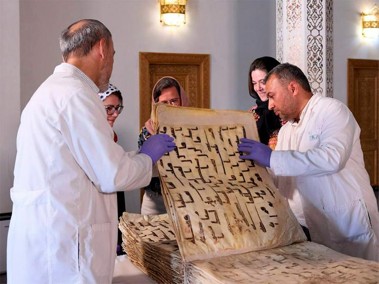 Restauradores examinan el Corán de Usmán, 2024. Foto: Fundación para el Desarrollo de la Cultura y el Arte de Uzbekistán