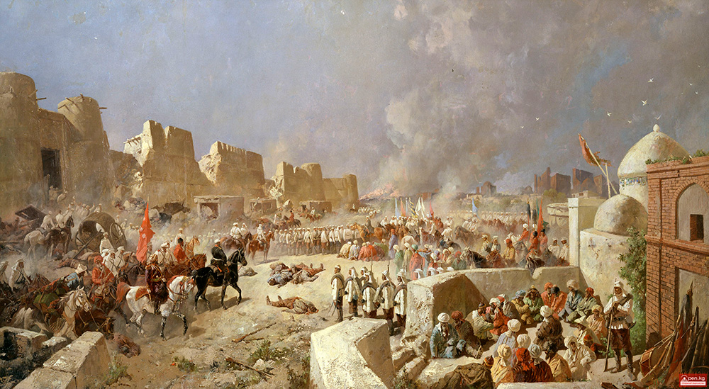 En mayo de 1868 las tropas rusas al mando del general Konstantín Kaufman conquistaron la ciudad. Ese mismo año, cuando las fuerzas rusas partieron en persecución del emir de Bujará, quedaba en la fortaleza de Samarcanda una guarnición rusa muy reducida: no más de setecientos hombres armados con fusiles, morteros y dos cañones. En la ciudad había 24 cañones de Bujará, pero estaban remachados e inutilizables.